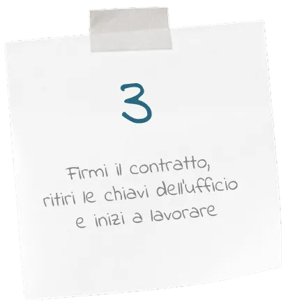 Indicaci quante postazioni ti servono e da quando: ti inviamo le opzioni disponibili. Firmi, ritiri le chiavi e inizi a lavorare. Il tuo ufficio è pronto. Ora tocca a te.